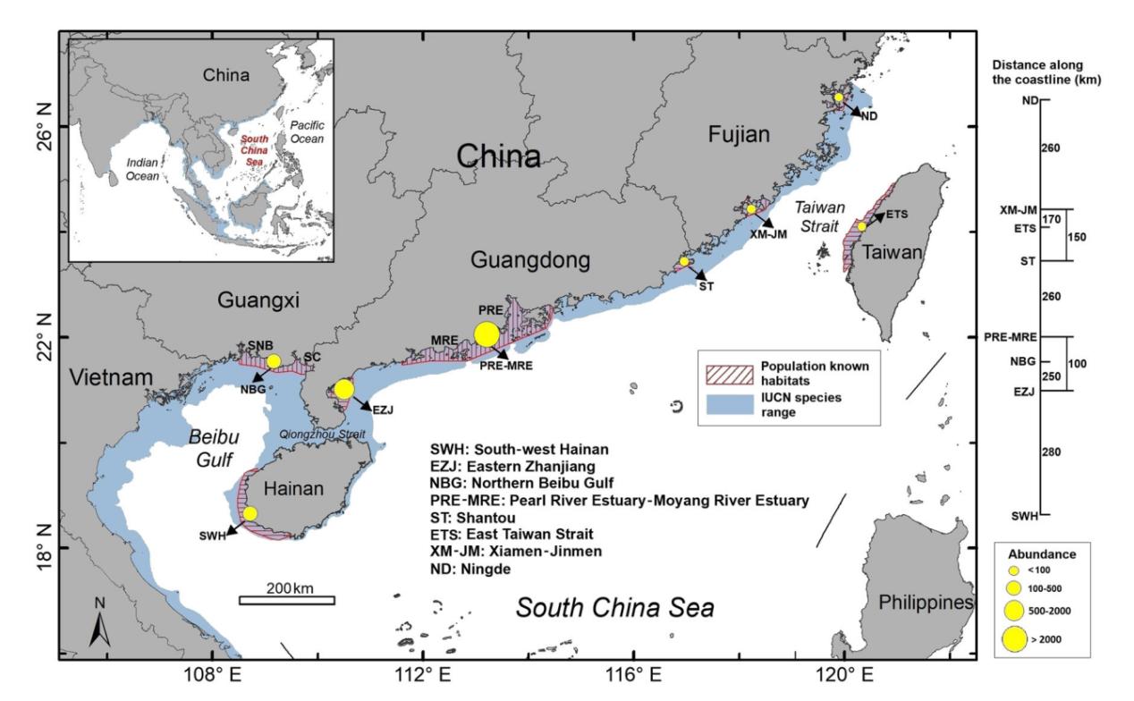 圖1 我國中華白海豚的棲息分布情況,藍色區域為IUCN紅色名錄提供的物種分布范圍,紅色區域為實地調查確定的棲息地,黃色圓圈顯示了種群規模,右側數字為連接相鄰種群的最近海上距離