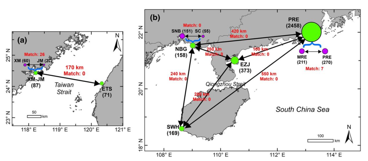 圖2 不同中華白海豚種群/亞種群的照片識別交叉比對結果示意圖:(a)廈門-金門和臺灣西海岸種群;(b) 海南西南部、湛江東部、北部灣和珠江口-漠陽江口種群。括號中的數字表示各區域已識別個體數量