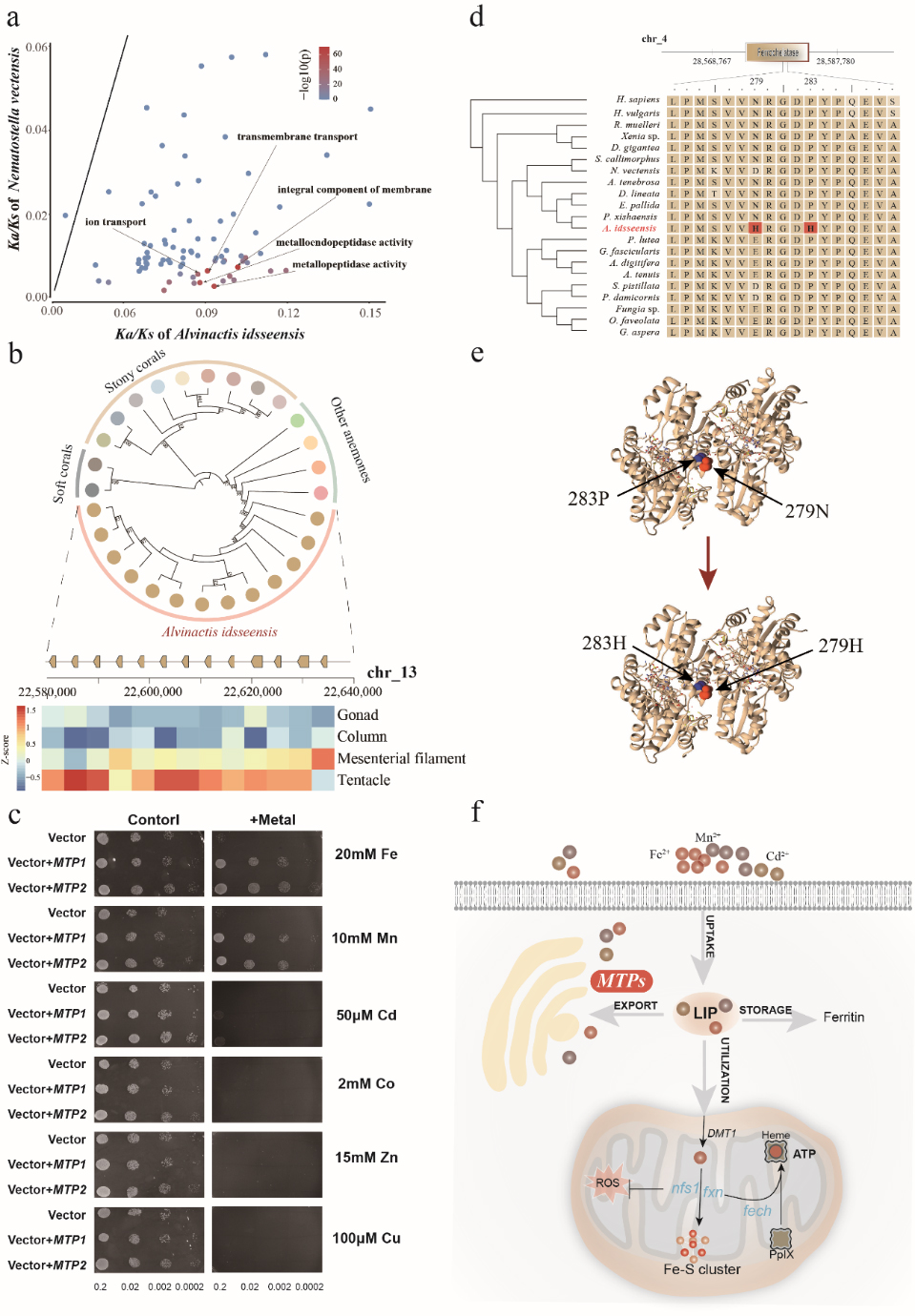 研究團(tuán)隊(duì)通過(guò)比較基因組分析發(fā)現(xiàn),該海葵基因組中分別有736/31個(gè)基因家族顯著擴(kuò)增/收縮。擴(kuò)增基因家族主要與金屬離子的結(jié)合、細(xì)胞膜和應(yīng)激反應(yīng)相關(guān),其中與金屬離子耐受相關(guān)的MTPs基因家族顯著擴(kuò)張,轉(zhuǎn)錄組分析發(fā)現(xiàn)大多數(shù)MTP基因主要在觸手中表達(dá)。由于MTP基因在無(wú)脊椎動(dòng)物中研究較少,為了更好地了解MTPs的功能,研究人員利用酵母表達(dá)系統(tǒng)對(duì)其進(jìn)行功能驗(yàn)證,結(jié)果發(fā)現(xiàn)攜帶MTP的酵母細(xì)胞只能在含有高濃度Fe2+和Mn2+的培養(yǎng)基中生長(zhǎng),這證明MTP可以幫助該海葵耐受Edmond熱液口環(huán)境中高濃度的Fe2+和Mn2+。