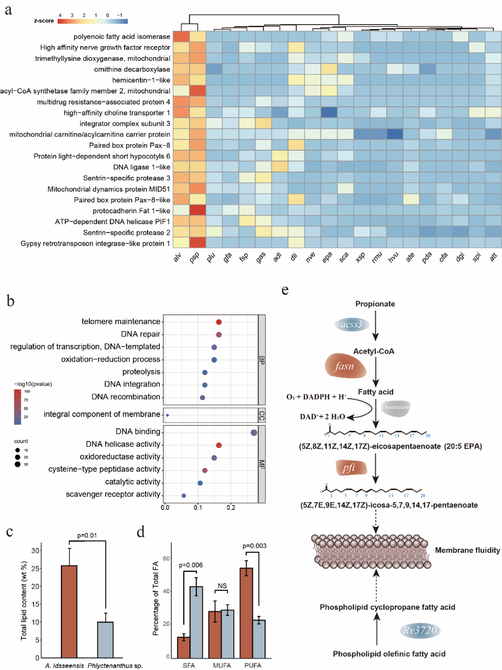 高靜水壓力會(huì)影響細(xì)胞膜流動(dòng)性、蛋白質(zhì)穩(wěn)定性、DNA 結(jié)構(gòu)和細(xì)胞骨架等,該研究結(jié)合團(tuán)隊(duì)已發(fā)表的深海海葵(Paraphelliactis xishaensis)基因組,通過(guò)分析發(fā)現(xiàn)在兩個(gè)深海海葵中有22個(gè)基因家族發(fā)生了共同擴(kuò)張,富集分析發(fā)現(xiàn)這些基因家族與DNA修復(fù)和細(xì)胞膜有關(guān)。為進(jìn)一步分析高靜水壓力對(duì)于細(xì)胞膜功能的影響,研究人員比較了該海葵和淺海海葵的總脂含量,發(fā)現(xiàn)該海葵相對(duì)于淺海海葵具有較高含量的多不飽和脂肪酸。有趣的是,參與不飽和脂肪酸合成的多個(gè)基因(fasn, acss3, pfi,和 Rv3720)發(fā)生了改變,其中fasn 基因在馬里亞納獅子魚(yú)Pseudoliparis swirei 基因組中同樣發(fā)生擴(kuò)張,這可能是深海生物應(yīng)對(duì)高靜水壓力的趨同進(jìn)化。