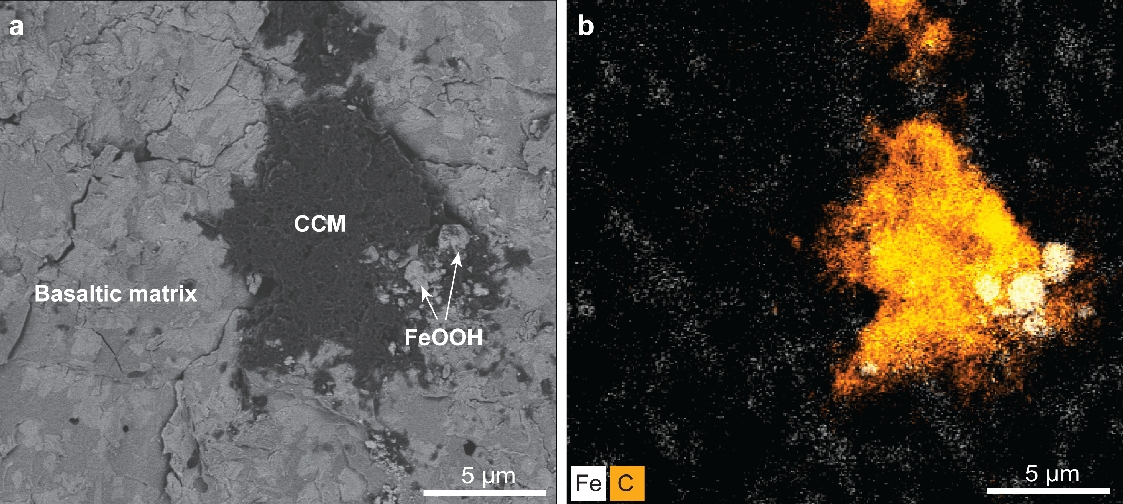 圖2 西南印度洋脊洋殼中微米級的非生物成因有機質及周圍針鐵礦的掃描電子顯微鏡照片