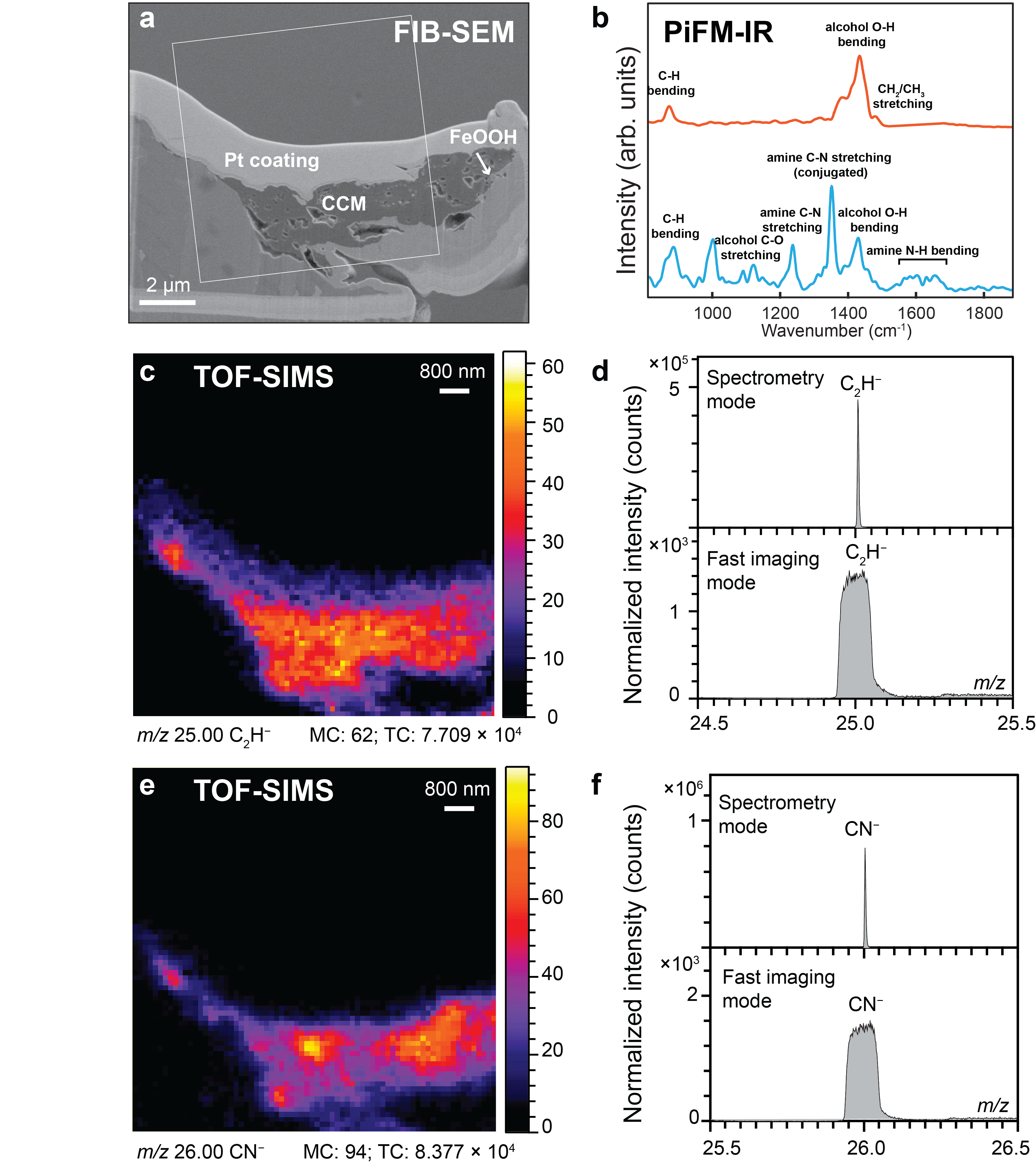 利用多模態微區原位分析技術,包括電子顯微鏡、飛行時間二次離子質譜儀以及光誘導力-納米紅外光譜儀等,綜合確認了有機質中特征生物分子官能團的缺失(圖3),從而揭示了其非生物成因。