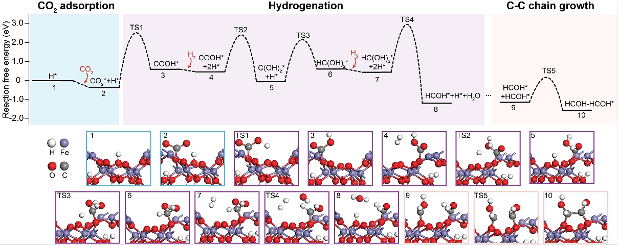 圖4 密度泛函理論計算揭示針鐵礦 (001)表面上的CO2加氫反應和C-C增長的反應路徑