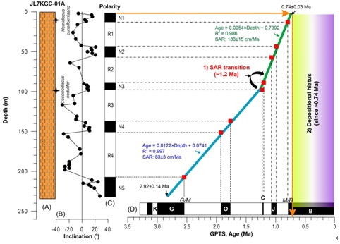 2 A,鉆孔巖性變化簡圖;B,磁傾角變化;C,鉆孔磁極性柱;D,國際標準磁極性柱。兩個主要發現是:1)沉積速率(SAR)的轉換;2)中更新世以來的沉積間斷。